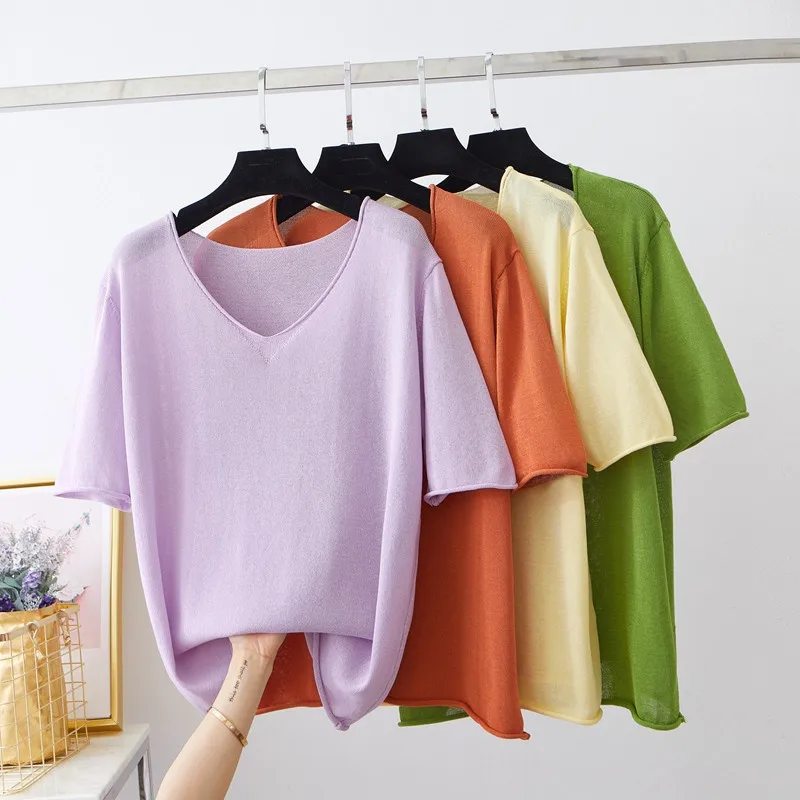 Свободная летняя тонкая трикотажная футболка оверсайз для женщин с треугольным вырезом, большой Топ для девушек, Повседневная футболка, базовый пуловер для женщин с коротким рукавом