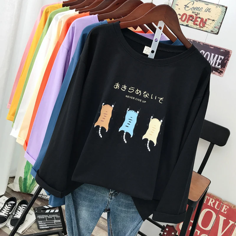 DONAMOL размера плюс Весна и осень чистый хлопок мягкая женская футболка свободный длинный рукав топы мультфильм Два кота шаблон печати Тройник