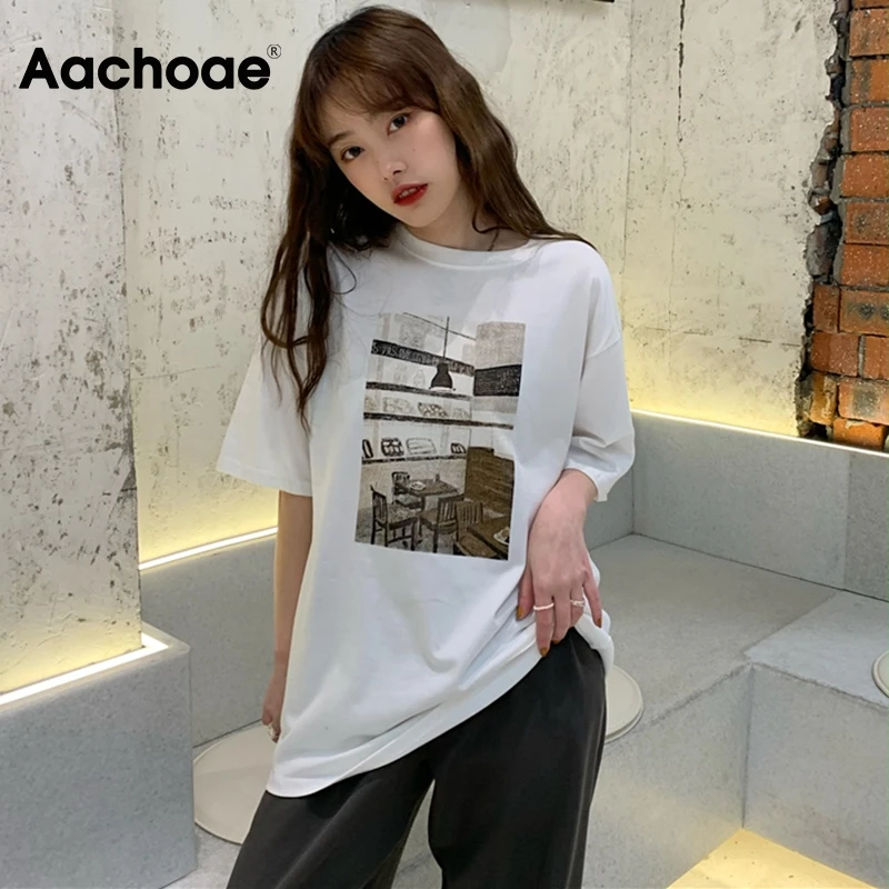 Aachoae белая футболка с круглым вырезом и принтом женская летняя футболка 2020 с коротким рукавом «летучая мышь» размера плюс свободная Базовая хлопковая Футболка Vetement Femme