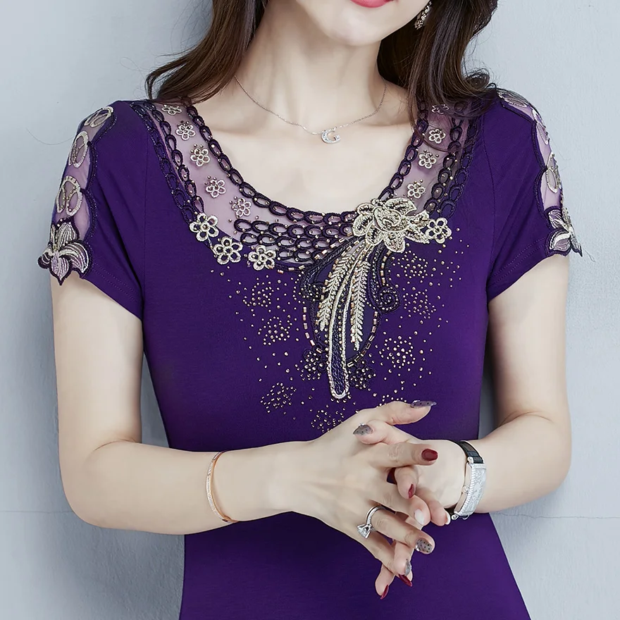 Модная повседневная женская футболка с коротким рукавом, элегантные тонкие женские топы с вышивкой бриллиантами, сетчатая летняя футболка ...