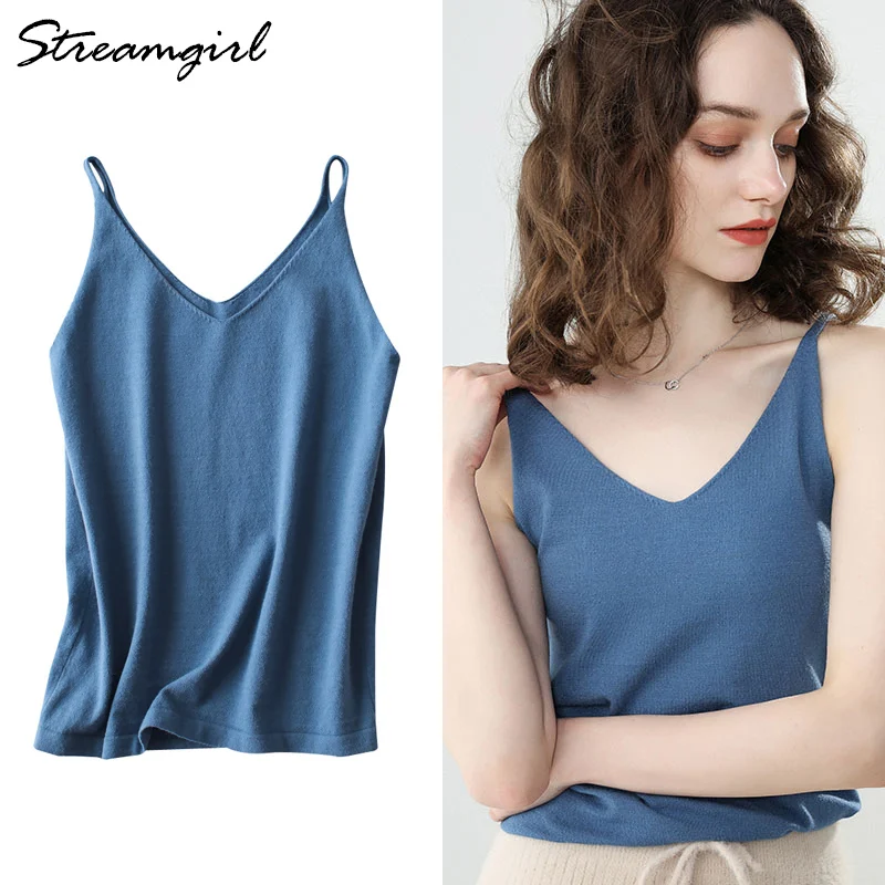 Вязаный топ на бретельках, топы на бретелях для женщин, летняя блузка на бретелях, без рукавов, трикотажный топ с v-образным вырезом, сексуаль...