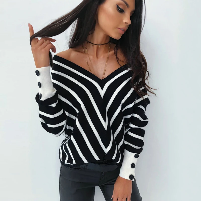 Черно-белые футболки с принтом в полоску женские футболки сексуальные с открытыми плечами с v-образным вырезом Летучая мышь с длинным рукав...