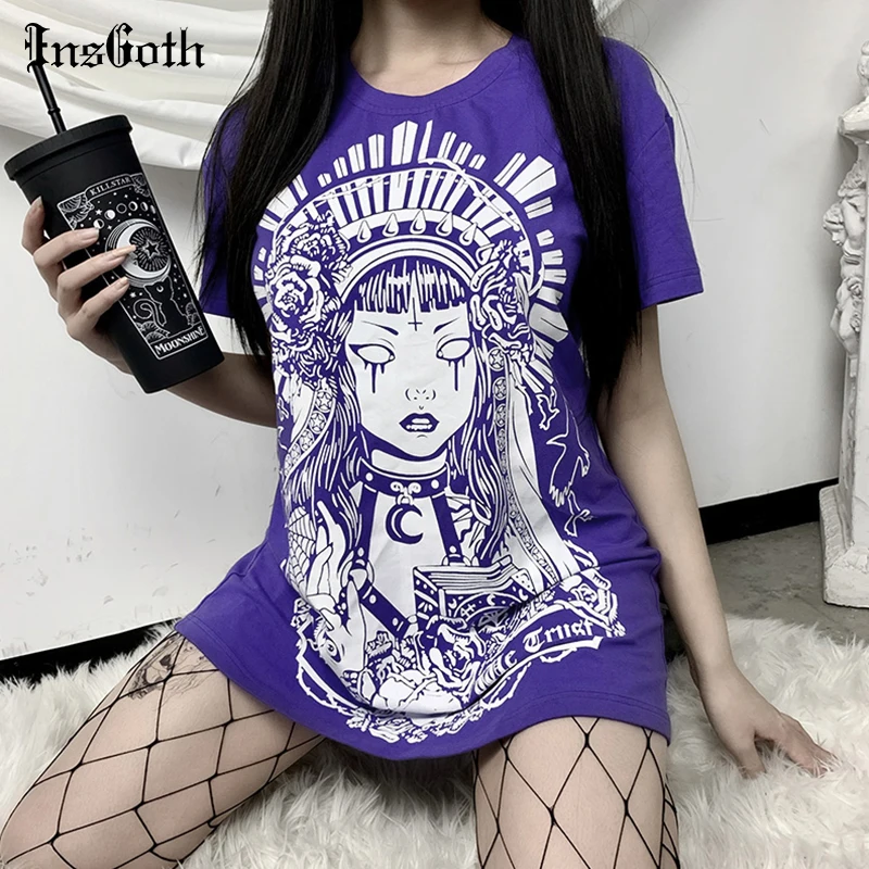 InsGoth женский укороченный топ, футболки, готический принт, облегающие сексуальные футболки, уличная одежда Harajuku, гранж, черные топы, лето