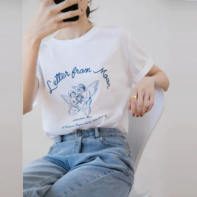 Новинка 2020, винтажная Женская хлопковая Футболка с принтом ангела, футболки с круглым вырезом, женская Свободная Повседневная модная летняя футболка