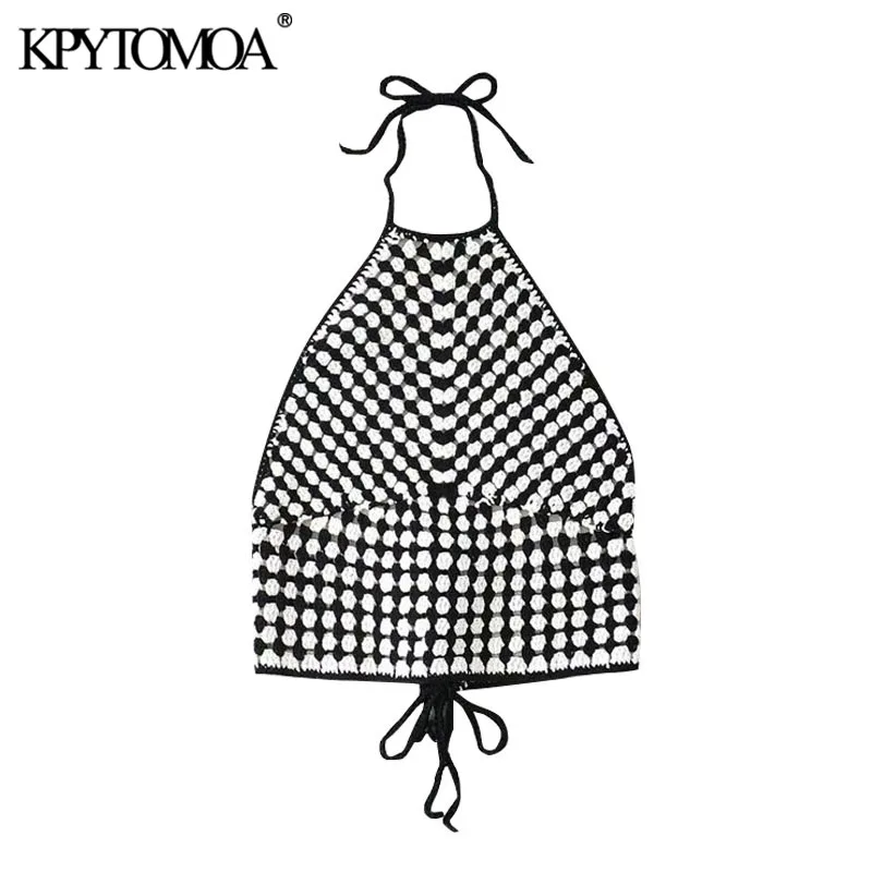 KPYTOMOA женская сексуальная мода 2020 клетчатая вязаная крючком майка Топы винтажные с открытой спиной на завязках Обрезанные женские рубашки Mujer