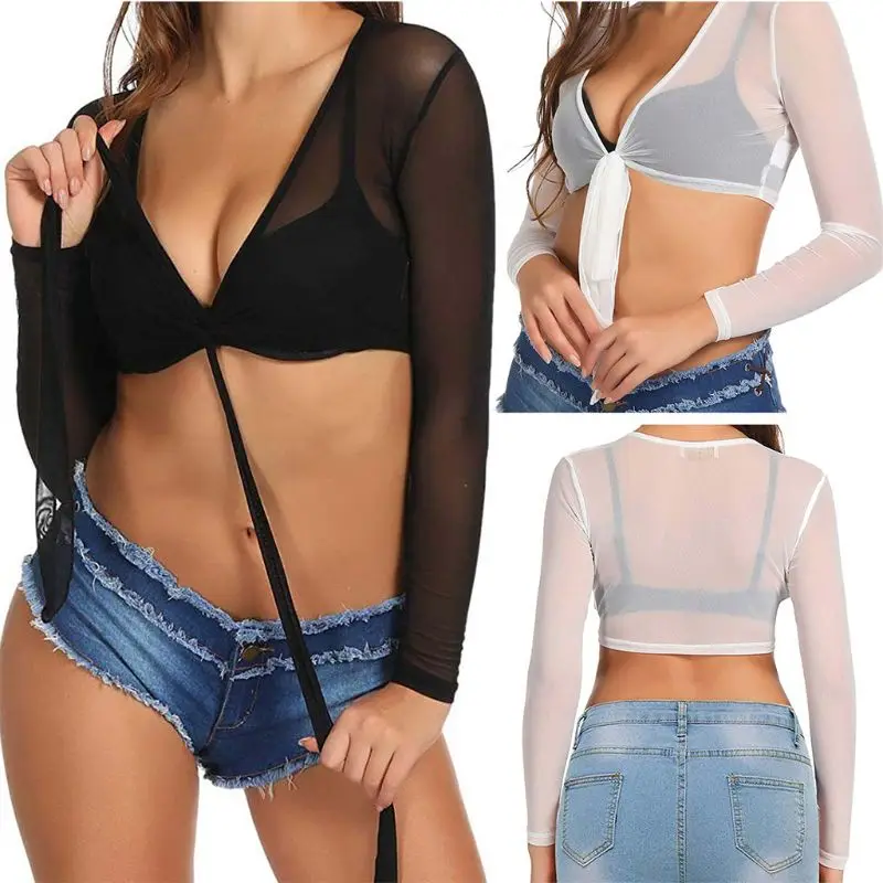 Женский сексуальный цельный сетчатый укороченный топ с длинным рукавом и v-образным вырезом, открытый передний кардиган с завязками