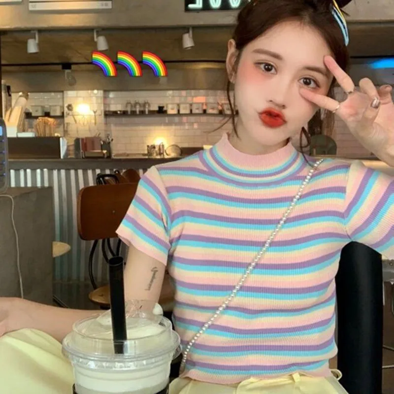 Летняя женская футболка в полоску с коротким рукавом тонкая маленькая Водолазка женская футболка уличная Женская