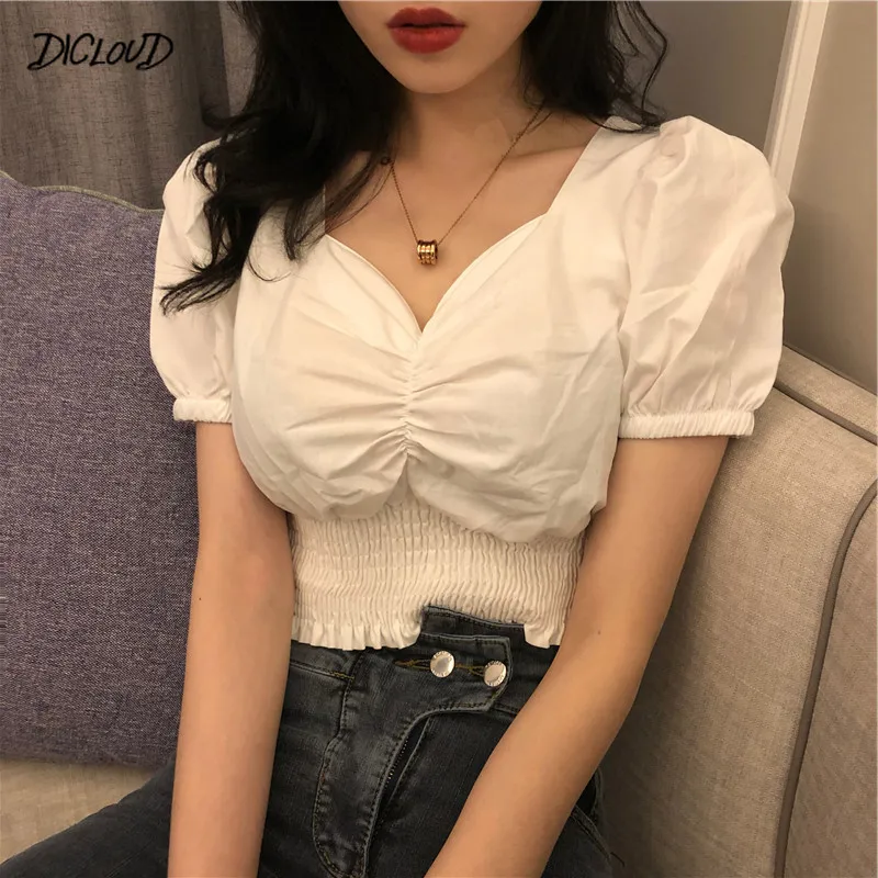 2020V воротник Сексуальная футболка Женская мода с пышными рукавами женские короткие топы облегающего размера плюс черные белые футболки женская одежда