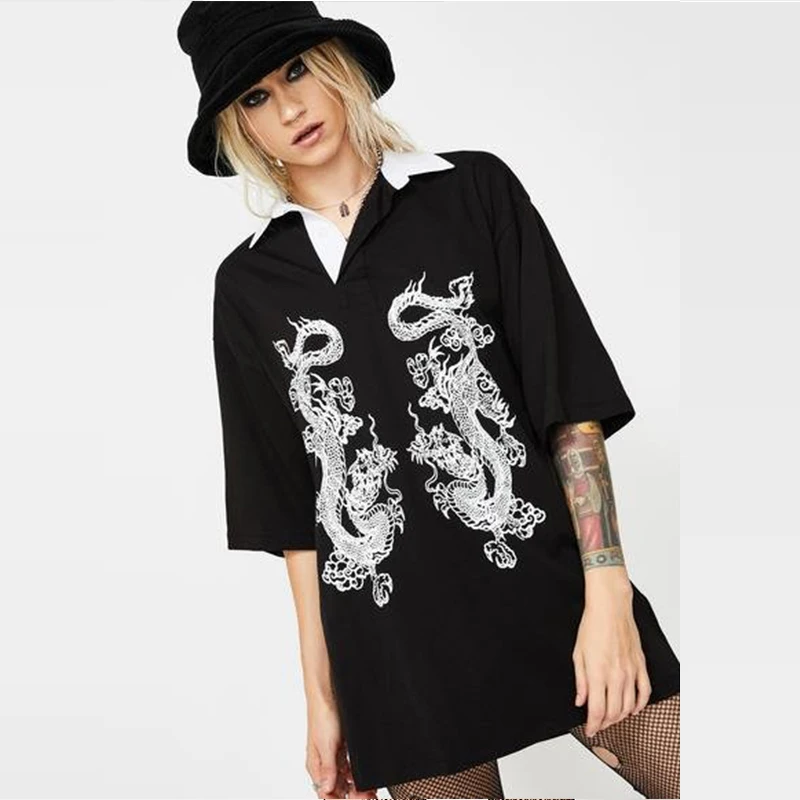 Готическая женская футболка 2019, короткий рукав, одноцветная, v-образный вырез, модный принт дракона, сексуальная одежда, винтажная уличная о...