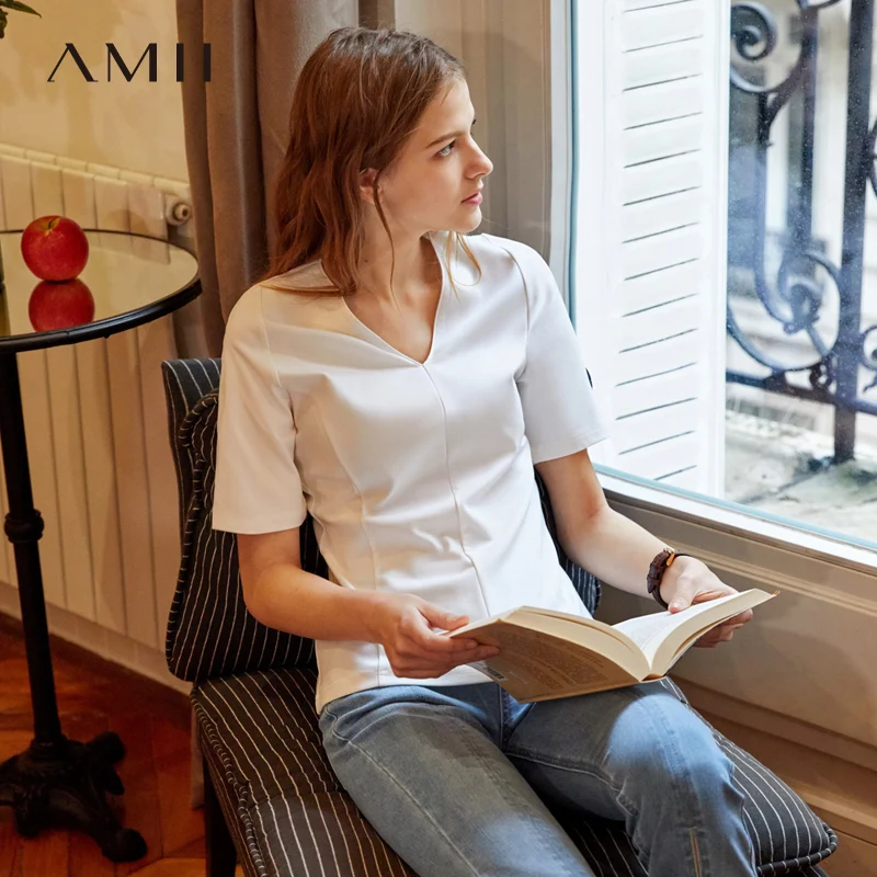 Amii минималистский для женщин V образным вырезом футболки сезон: весна-лето 2019 повседневные однотонные короткий рукав тонкий элегантны