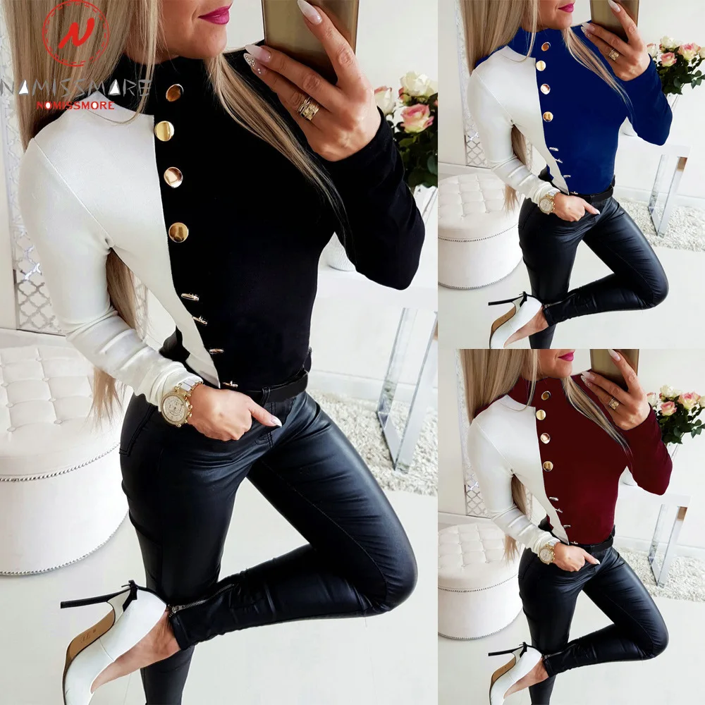 Женские футболки с длинными рукавами для уличной одежды, Лоскутные цвета, подходящие для дизайна, на пуговицах, с круглым вырезом, с длинным ...