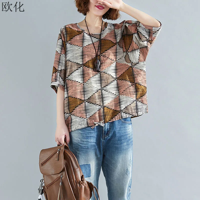 Женские футболки размера плюс с рукавом летучая мышь, хлопковые льняные футболки, женские футболки большого размера в полоску с геометриче...
