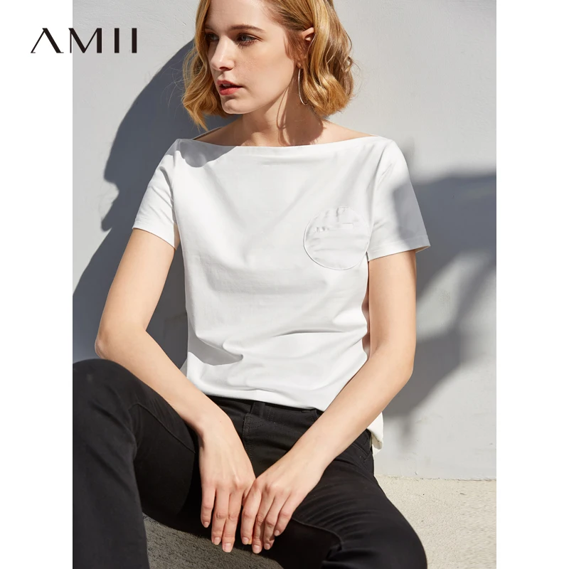 Amii минималистский футболки для женщин сезон: весна-лето 2019 повседневные однотонные короткий рукав Slash Воротник лоскутное хлопок женск