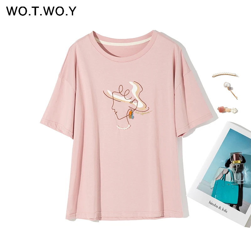 Женские хлопковые футболки WOTWOY, Повседневные вязаные футболки с круглым вырезом и принтом, с жемчугом и бусинами, 2020