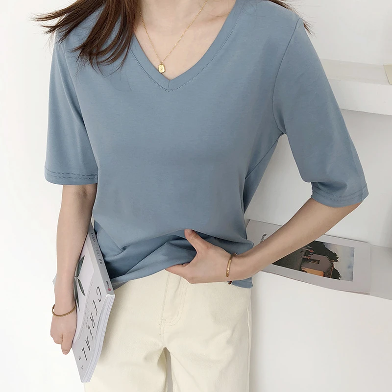 Мягкая хлопковая Футболка с v-образным вырезом, женские футболки с коротким рукавом, летний Повседневный однотонный топ 2020