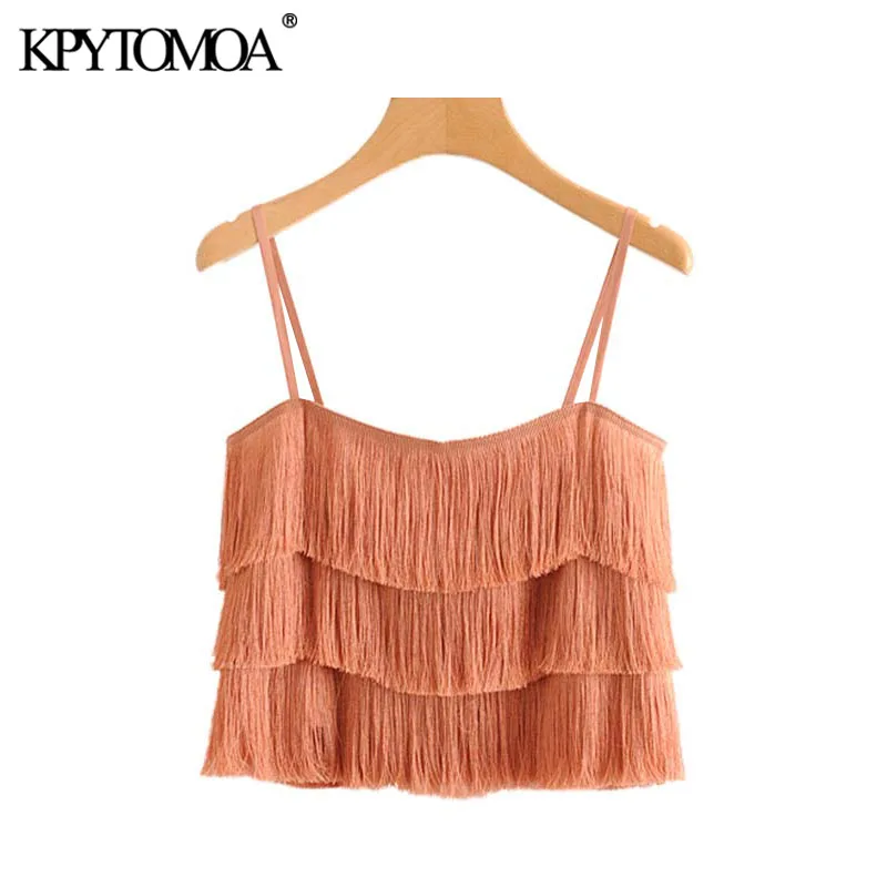Винтажная Сексуальная укороченная майка с оборками и кисточками для женщин, мода 2020, открытая спина, на тонких бретелях, вечерние, для клуба,...