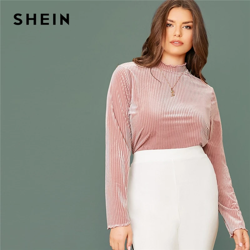 SHEIN Женский бархатный топ размера плюс с отделкой салата, весенне-зимние базовые однотонные Топы с длинным рукавом и стоячим воротником, пов...