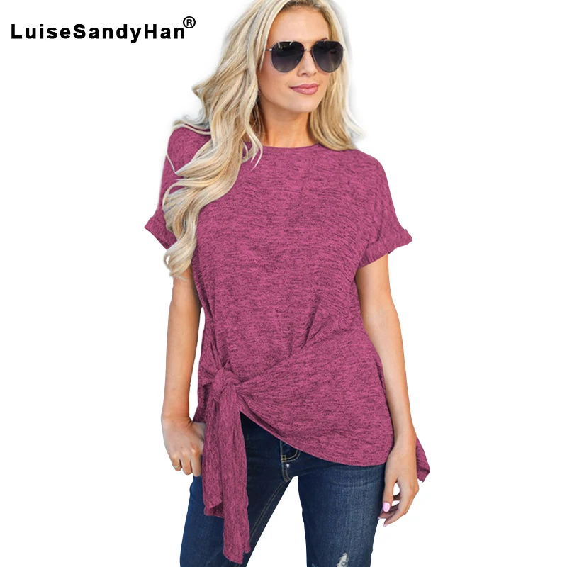 Летние Для женщин Круглый вырез узел с коротким Футболка с рукавами талии широкие свободные однотонные Цвет средней длины Футболка Пуловер женский 2020 Весна