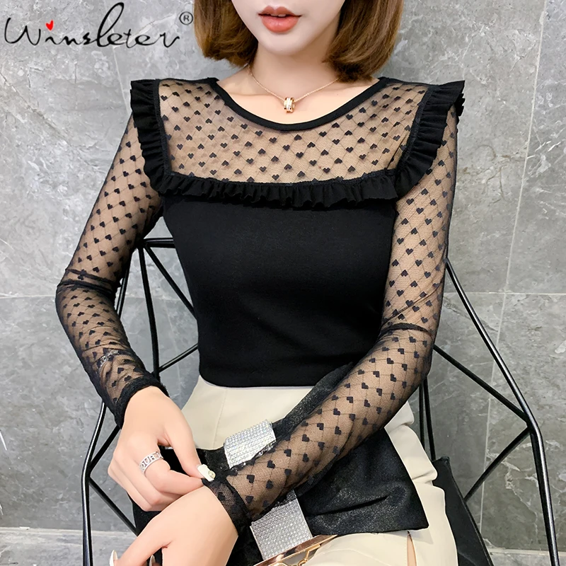 Hugcitar puff с длинным рукавом кружево сетки прозрачные Лоскутные пикантные Топы 2019 для женщин Весенняя вечерние партии уличные футболки