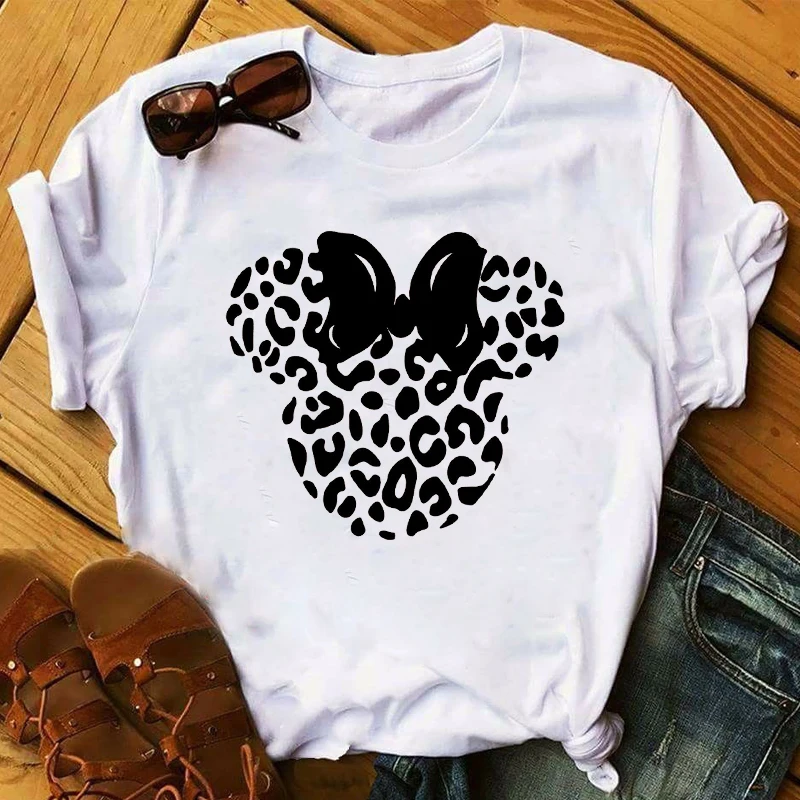 Женская мода 2020, Леопардовый бант, Милый принт с ушками, короткий рукав, Женский Топ, футболка, одежда для девушек, графические футболки, женская футболка