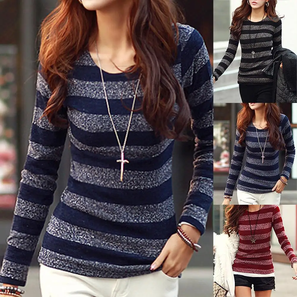 Новый женский модный Полосатый пуловер с длинными рукавами и круглым вырезом облегающий джемпер