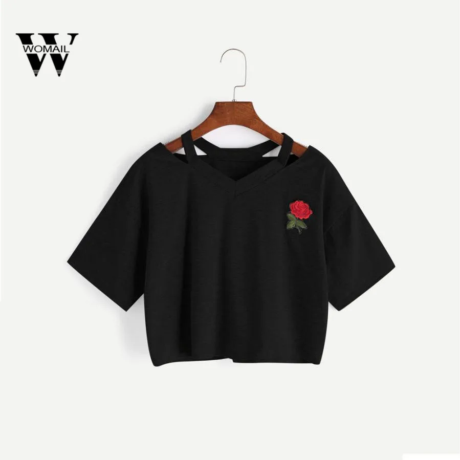 2018 летние Для женщин с вышивкой роз короткий рукав Повседневное короткая футболка с v-образным вырезом жилет топы удивительные горячая расп...