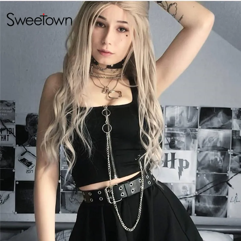Черная майка в стиле панк, готика, с металлическими цепочками, с открытыми плечами, сексуальные вечерние топы для женщин, уличная одежда, лет...