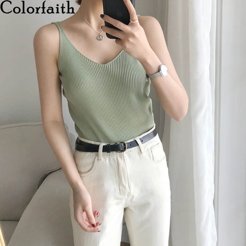 Colorfaith, новинка 2020, весна-лето, женские топы, одноцветные, разные цвета, майки, сексуальные, базовые, вязанные, с v-образным вырезом, топы V6202