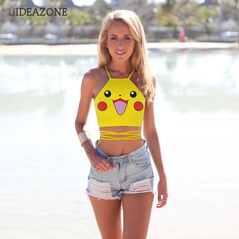 2018 Пикачу 3D Крест Холтер Растениеводство TopsWomen летние короткие с низким вырезом печати майки Топ Бюстье топики женские милый мультфильм Жен...