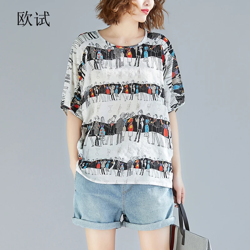 2019 летняя футболка размера плюс, женская футболка с принтом аниме, большой размер, хлопковая льняная футболка, женская Свободная Повседневн...