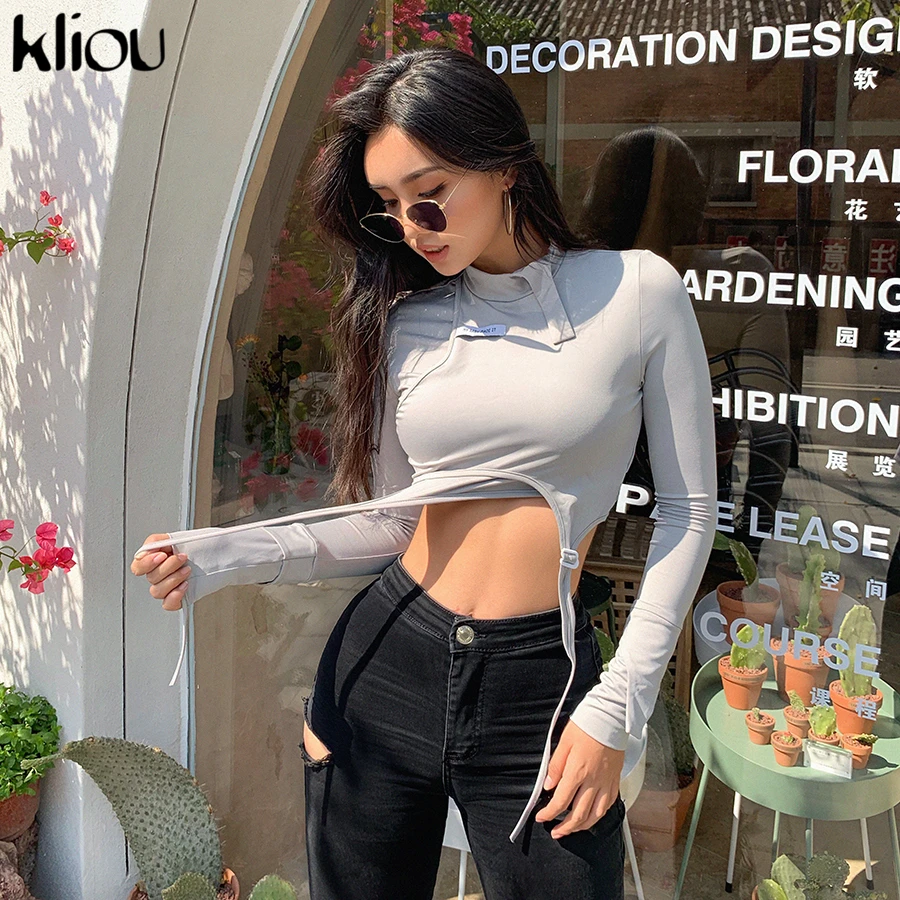 Kliou модный однотонный серый облегающий укороченный топ с высоким воротом для женщин 2019 осень новая шелковистая Удобная футболка Верхняя лента уличная одежда