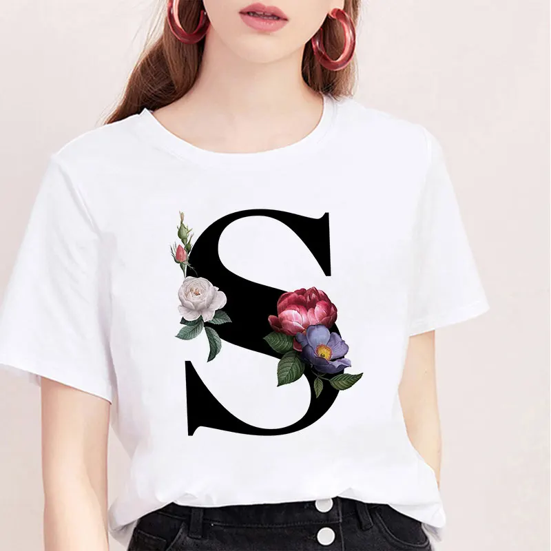 Dropshipping T Shirt Women 26 English Alphabet With Flowers Letter Rose Print Tshirt O-neck Summer Fashion Casual Punk Tees Tops
