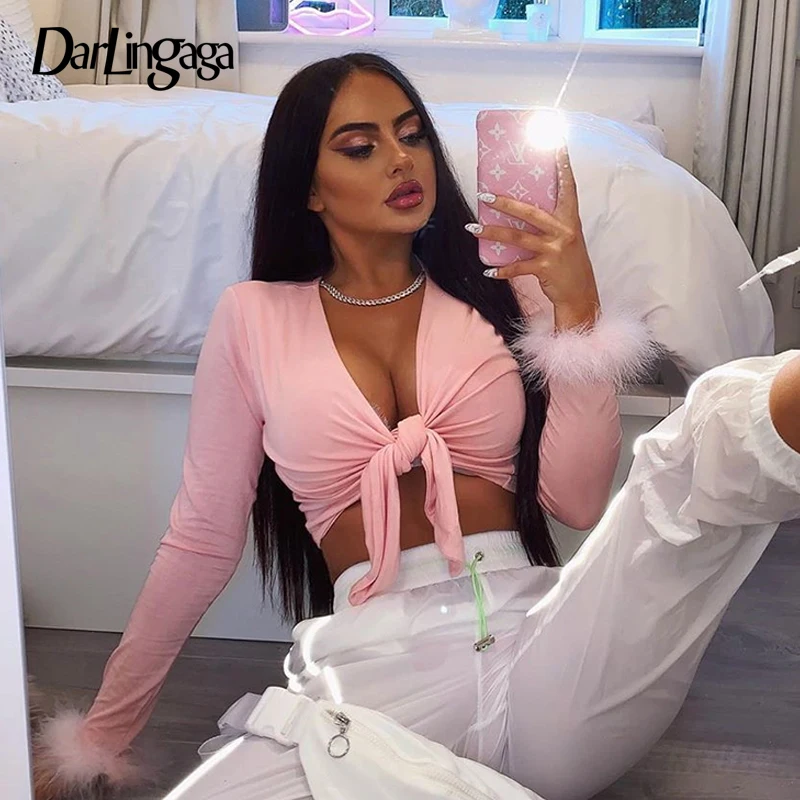 Darlingaga, v-образный вырез, розовая, на шнуровке, Сексуальная футболка, модная, длинный рукав, перо, Осенние футболки для женщин, короткий топ, фу...