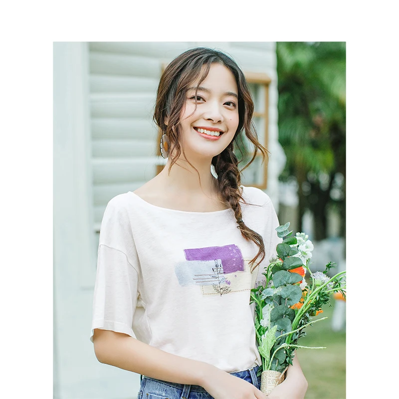 INMAN 2020 Лето Новое поступление льняная хлопковая свободная футболка с круглым воротником и открытыми плечами и принтом