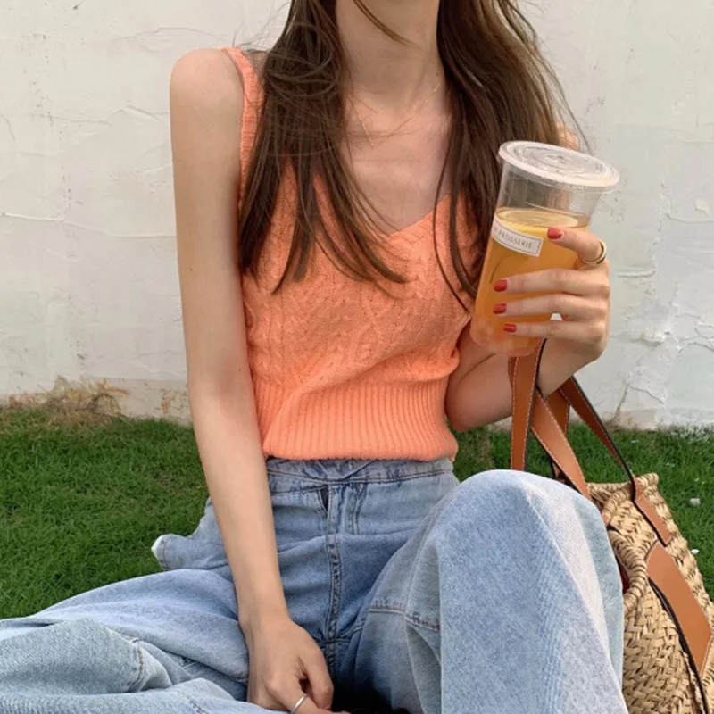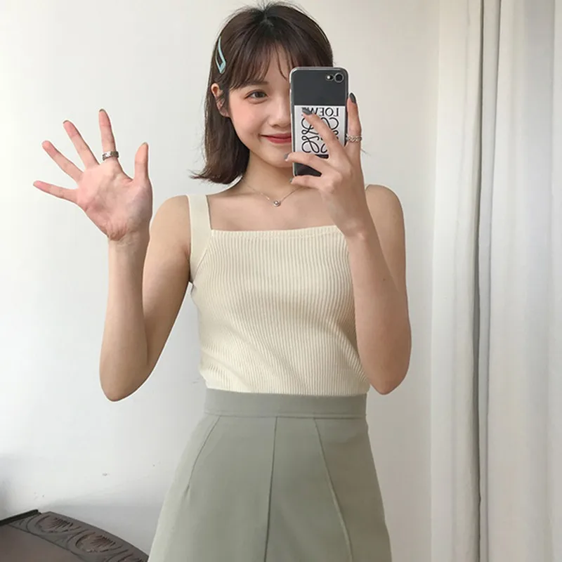 Женская хлопковая рубашка, милые топы, женский сексуальный однотонный пуловер с квадратным воротником без рукавов, вязаный укороченный топ на бретелях, вечерние