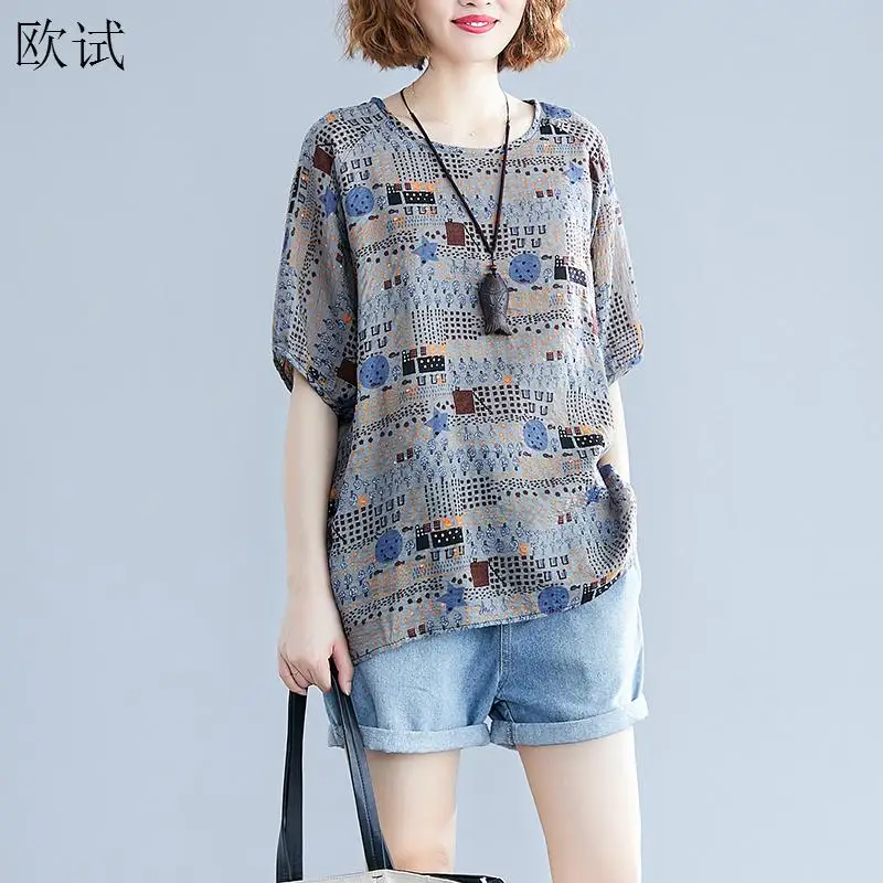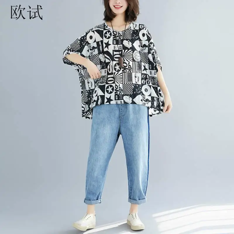 Большие размеры, футболка с геометрическим принтом, графические футболки для женщин, Корейская хлопковая Футболка с рукавом летучая мышь, топы для женщин 4XL 2020, летняя футболка