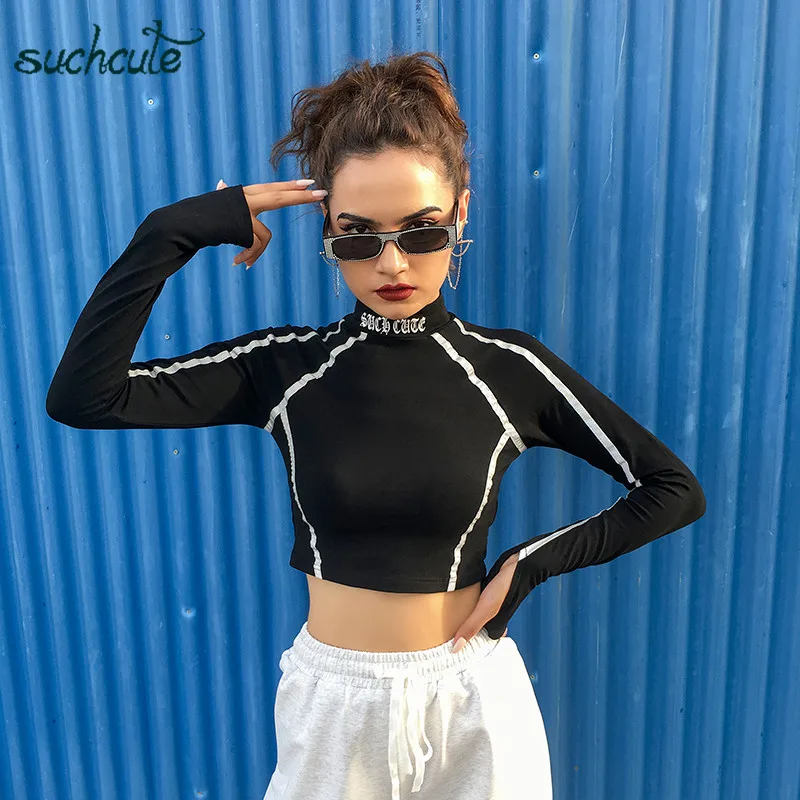SUCHCUTE с буквенным принтом женская футболка Светоотражающая Modis Longslive Уличная Повседневная Черная Рубашка 2019 топы в Корейском стиле для женщи...