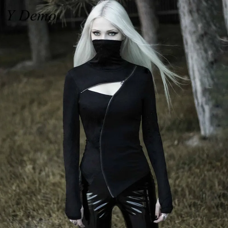 Готический Черный выдалбливают тонкий длинный рукав футболка Женская Повседневная молния открытая водолазка Techwear тройники