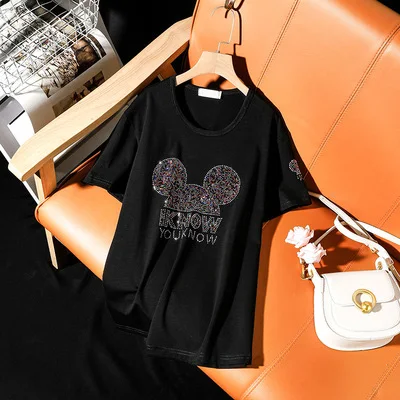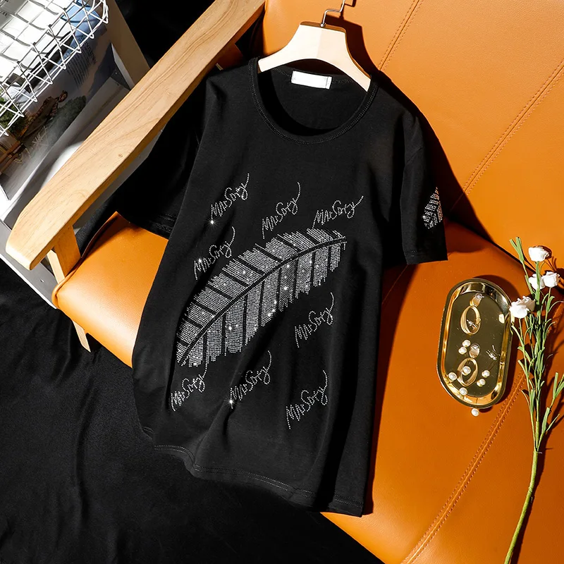 2020 лето новый корейский плюс размер хлопка с коротким рукавом футболки женская мода стиль листья черный горячий алмаз свободные женские топы