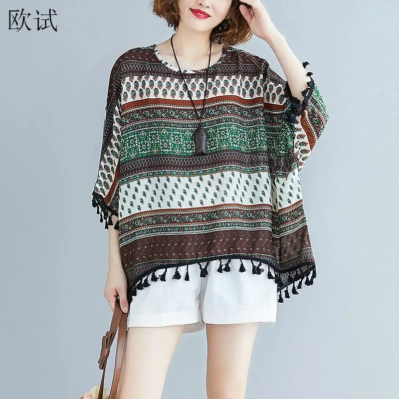 Размера плюс летняя футболка в полоску с цветочным принтом 2020 Женская Повседневная футболка размера d хлопковая льняная Футболка с рукавами летучая мышь 4XL 5XL