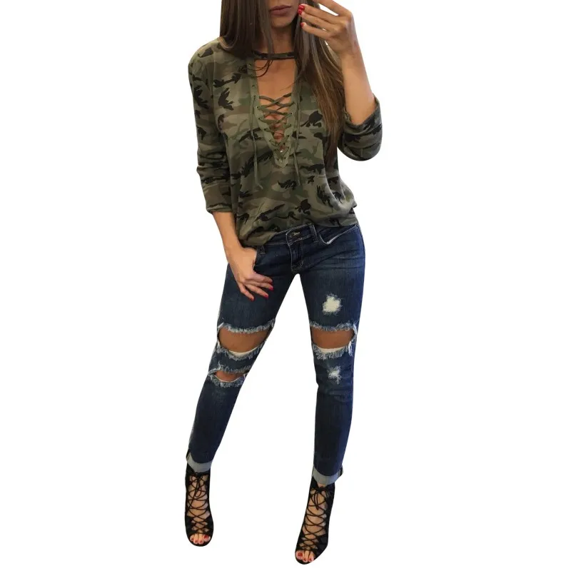 Пикантные топ с камуфляжным принтом для женщин камуфляжная футболка V средства ухода за кожей шеи кружево до футболка повседневное дамы сво...