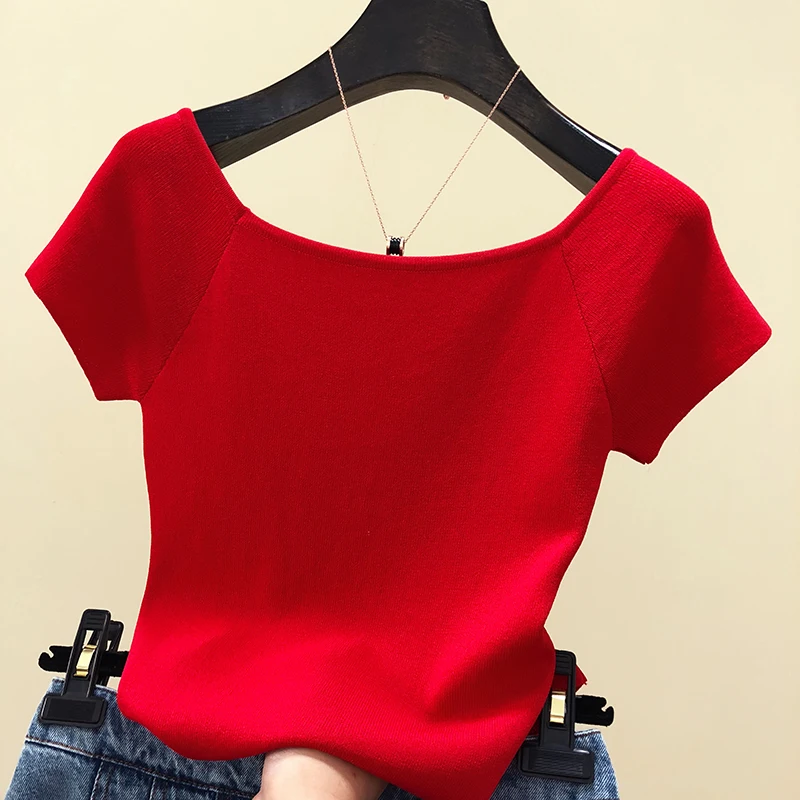 Однотонная трикотажная футболка с квадратным воротником, новая женская простая Трикотажная футболка с короткими рукавами, топы для девочек, лето 2020