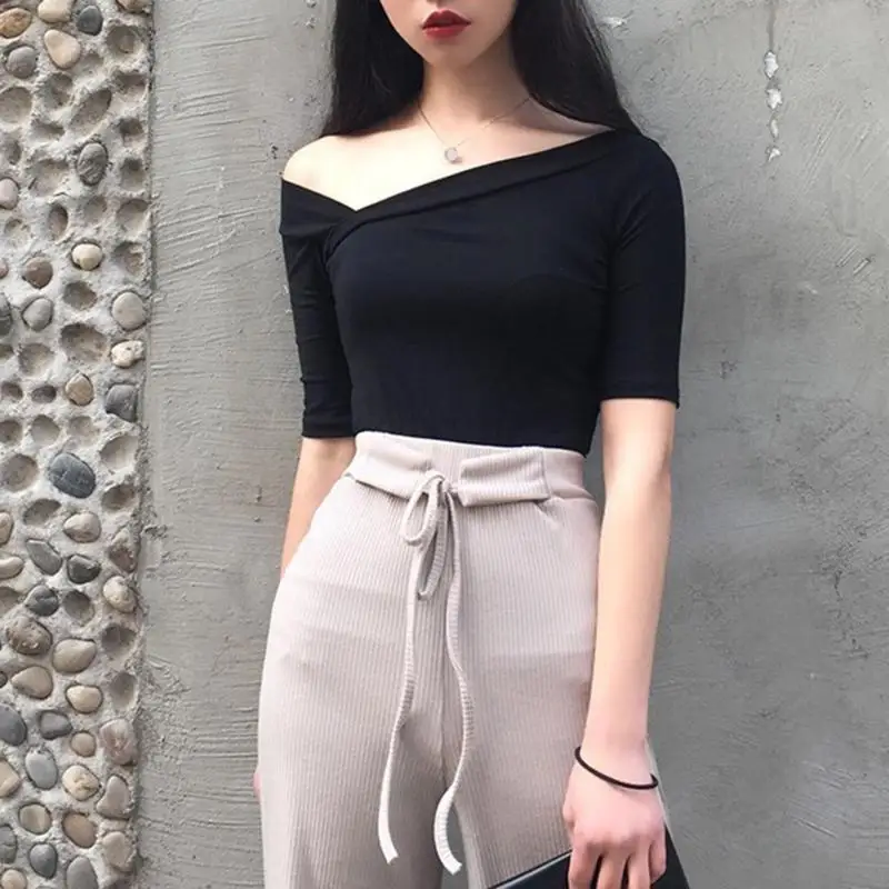 Женская нерегулярная футболка на одно плечо женская сексуальная с v-образным вырезом с коротким рукавом тонкие топы летние на одно плечо Од...