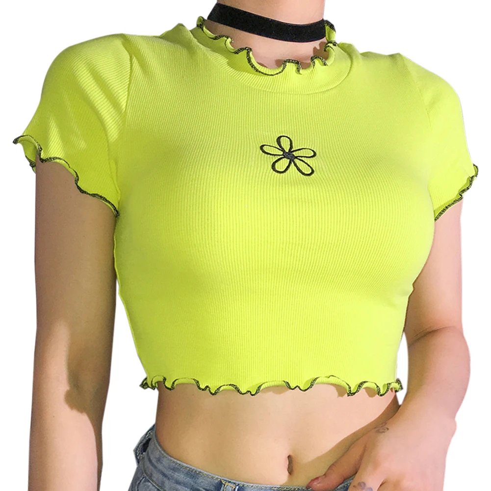 2019 Новые Женская одежда с рюшами и цветочным принтом средства ухода за кожей шеи Женская футболка короткий рукав для женщин футболка тонкий...