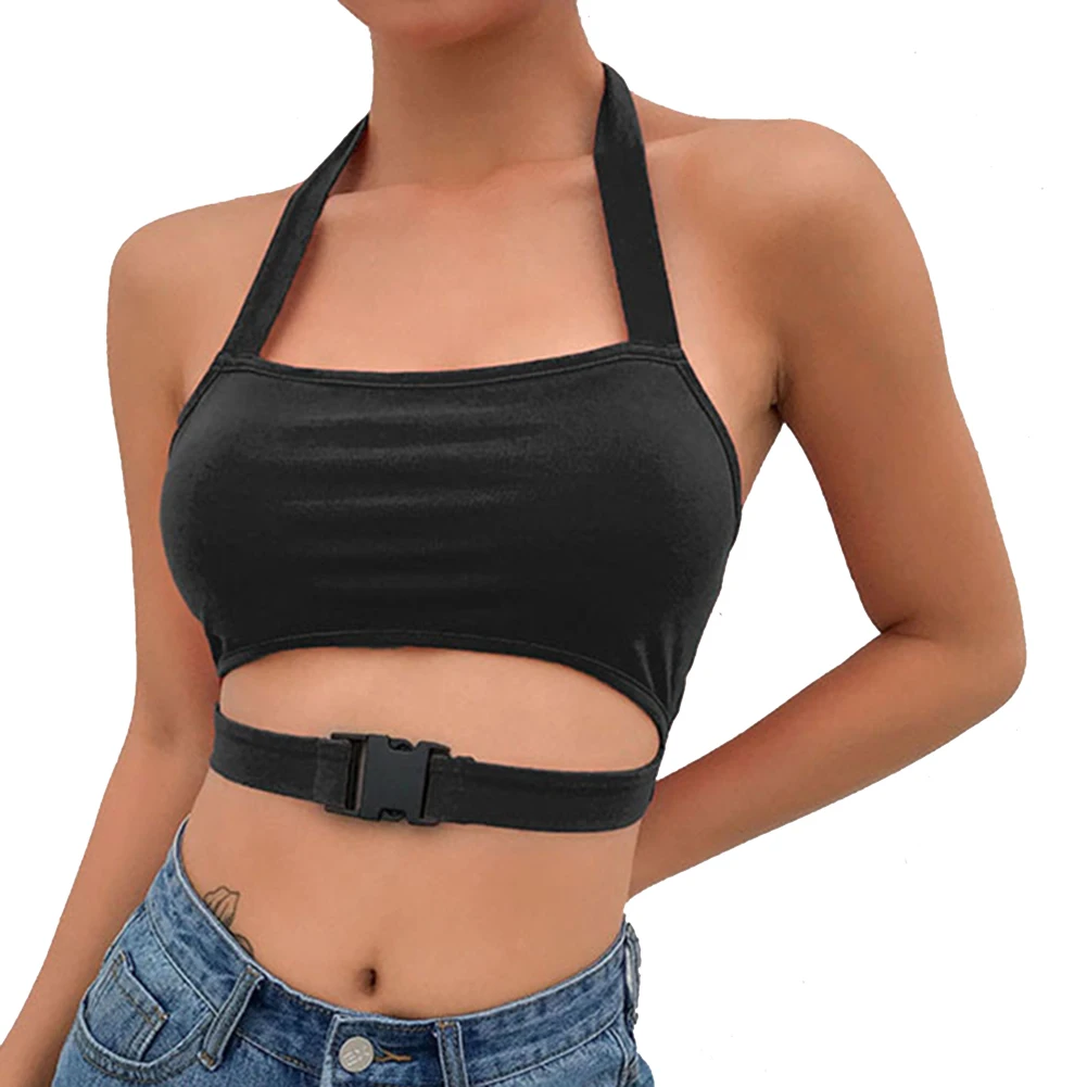 Женские летние сексуальные нерегулярные выдалбливают с завязками на шее короткий топ дамы Кнопка Топик с низким вырезом на спине без рукав...