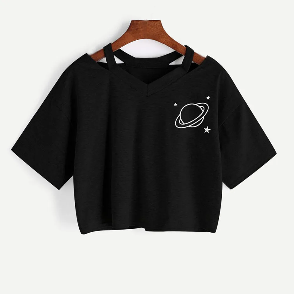 VOGUE модные женские туфли Повседневное Для женщин футболки Street Тонкий Летняя черная футболка Для женщин 2019 планета печати Тонкий топы футбол...