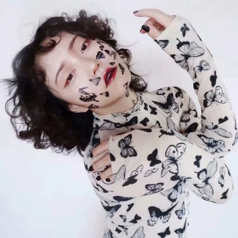 Эксклюзивный Harajuku Осень Зима Водолазка с длинным рукавом сетки топы корректирующие принтом бабочки футболка для женщин camiseta transparente mujer