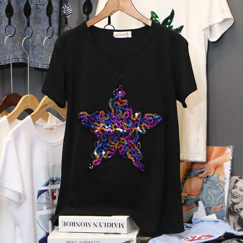 2018 летние Donna Новая мода M-3XL плюс Размеры футболка Для женщин пятиконечная звезда блесток короткий рукав футболки Повседневное хлопковая Фу...