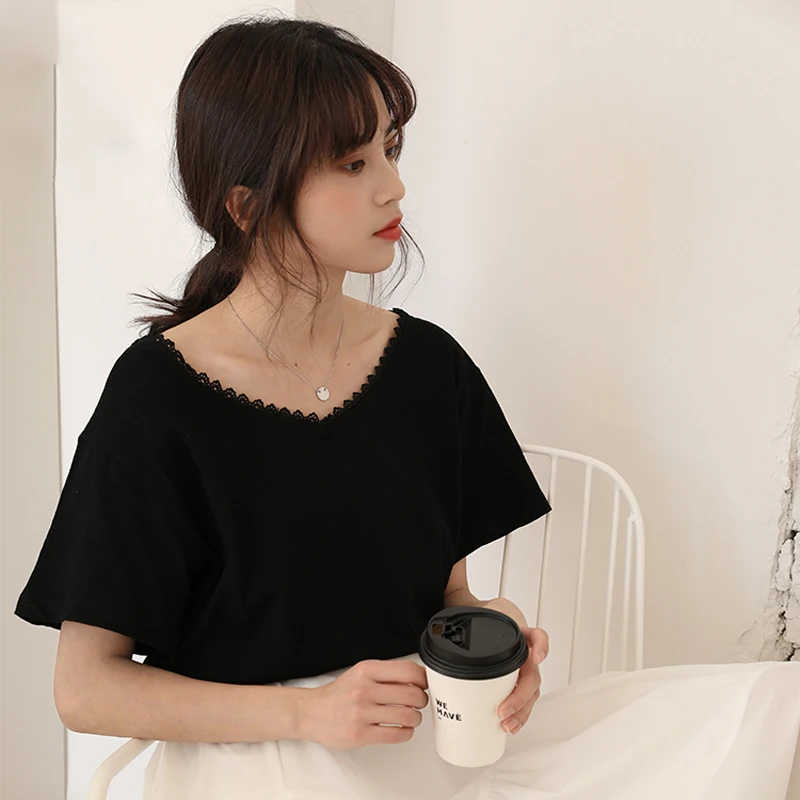 2019 новые женские Базовая футболка корейская мода кружева v-образным вырезом с коротким рукавом Футболка женские летние повседневные топы