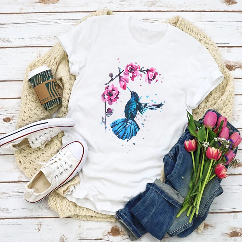 Женская модная летняя футболка с рисунком птицы и цветами, топы, женская одежда, футболка, женская одежда, футболка, женская футболка